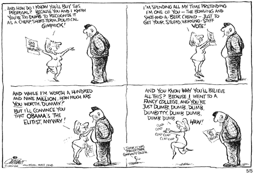 If Hillary Clinton gets the nomination of the Democrat party, I won’t be able to vote for her. It seems to me that she’s being dishonest with the electorate. A very good example is her ridiculous push for cutting gas-taxes during this summer. It’s not a reasonable proposal from an environmental, economic, and personal point of view. Oliphant has a great cartoon about it today.